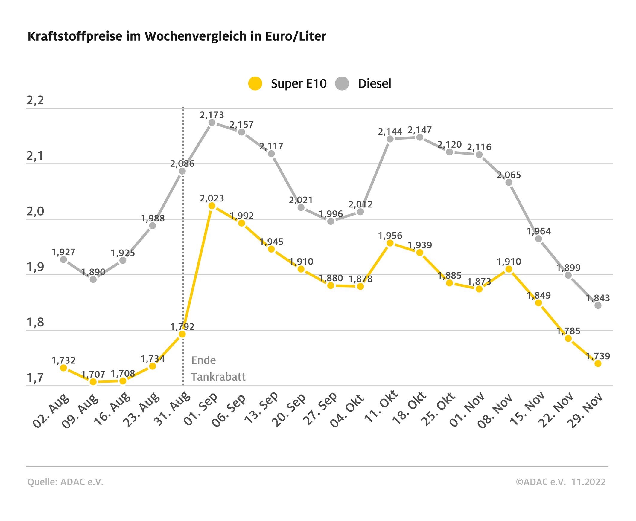 München (ots) Die Entspannung am Kraftstoffmarkt hat sich auch in der vergangenen Woche fortgesetzt. Sowohl Benzin als auch Diesel sind erneut deutlich günstiger als vor Wochenfrist – dies zeigt die aktuelle ADAC Auswertung der Kraftstoffpreise in Deutschland. Danach kostet ein Liter Super E10 im bundesweiten Mittel 1,739 Euro – das ist ein Minus von 4,6 Cent. Noch etwas deutlicher ist der Dieselpreis gesunken: Für einen Liter müssen die Autofahrer derzeit im Schnitt 1,843 Euro bezahlen und damit 5,6 Cent weniger als in der Vorwoche.
