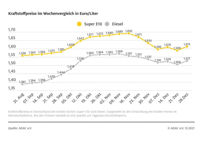 München (ots) – Das neue Jahr startet mit einem Anstieg der Spritpreise. Das ermittelt der ADAC in seinem wöchentlichen Preisvergleich. Demnach kostet ein Liter Super E10 im bundesweiten Mittel 1,648 Euro. Das entspricht einem Anstieg von 3,5 Cent im Vergleich zur Vorwoche. Ein Liter Diesel kostet aktuell an den Zapfsäulen im Bundesschnitt 1,562 Euro –…