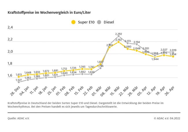 München (ots) – Nach dem dramatischen Anstieg der Kraftstoffpreise im März hat sich die Situation an den Tankstellen im April etwas entspannt. Von einer Entwarnung kann jedoch noch lange nicht gesprochen werden. Wie die aktuelle ADAC Auswertung der Kraftstoffpreise in Deutschland zeigt, kostete ein Liter Super E10 im April 2022 im Mittel 1,970 Euro – das…
