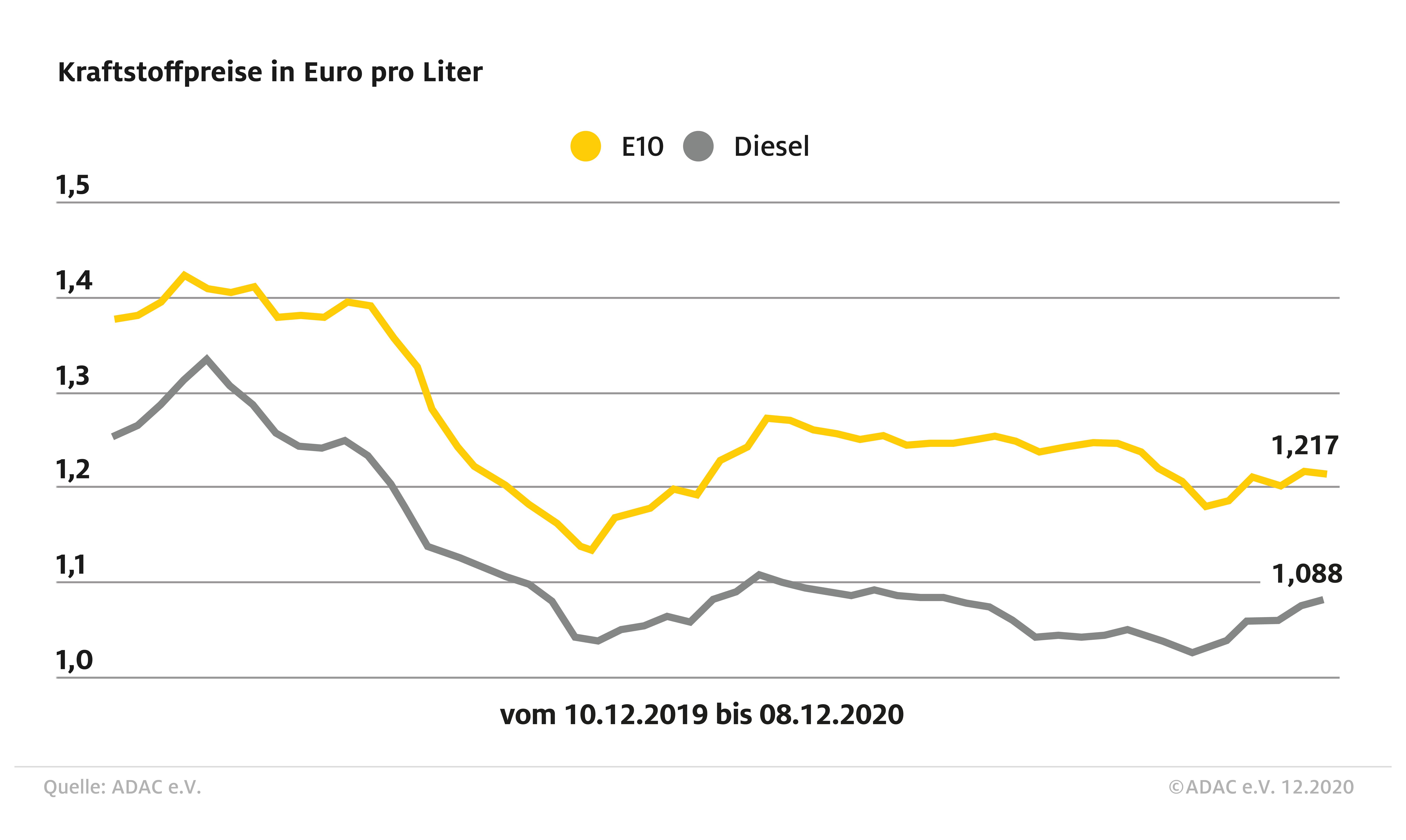 Mit der aktuellen Entwicklung haben sich die Preise der beiden Kraftstoffsorten erneut angenähert – die Differenz beträgt derzeit 12,9 Cent je Liter. Die steuerliche Preisdifferenz zwischen Benzin und Diesel liegt bei knapp 22 Cent. Kaum verändert gegenüber der Vorwoche ist mit 49 US-Dollar der Preis für ein Barrel Rohöl der Sorte Brent.