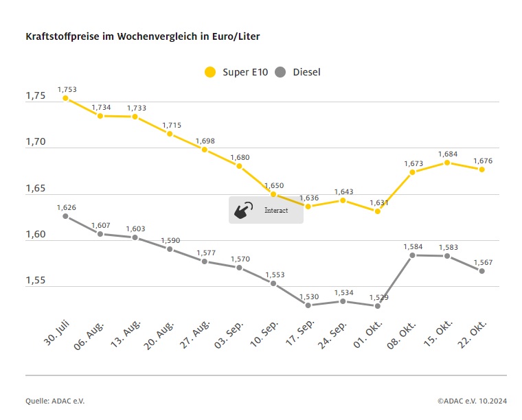 Im Durchschnitt kostete am 22. Oktober ein Liter Benzin 1,676 Euro, für Diesel mussten die Autofahrerinnen und Autofahrer 1,567 Eurobezahlen.