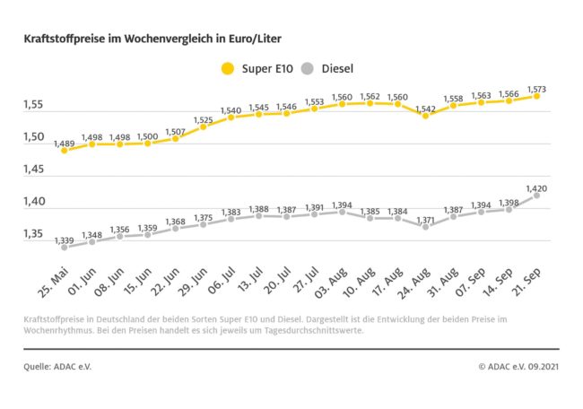 München (ots) Die Spritpreise befinden sich weiter auf Höhenflug. Wie die aktuelle ADAC Auswertung der Kraftstoffpreise zeigt, stieg der bundesweite Durchschnittspreis für einen Liter Diesel im Schnitt um 2,2 Cent und lag zuletzt bei 1,420 Euro. Auch Super E10 verteuerte sich im Vergleich zur Vorwoche um 0,7 Cent auf 1,573 Euro je Liter. Kraftstoffpreise im…