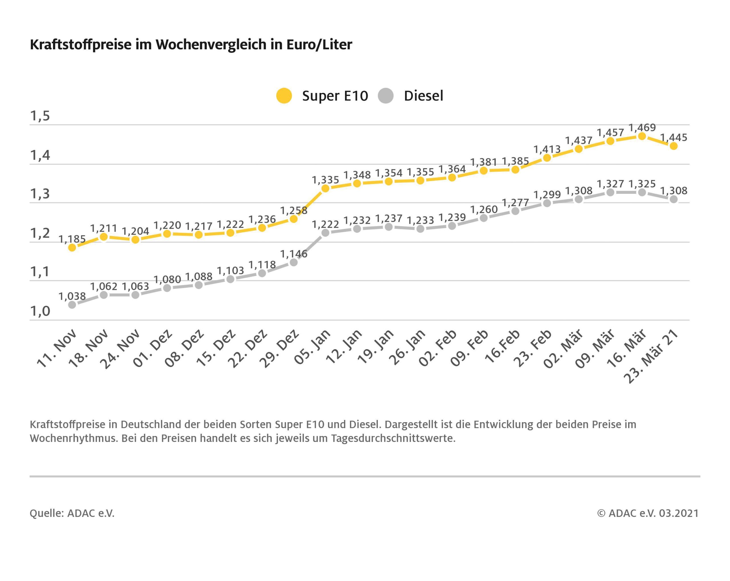 Erstmals seit Anfang Dezember 2020 ist der Benzinpreis im Vergleich zur Vorwoche gesunken. Das zeigt die aktuelle ADAC Auswertung der Kraftstoffpreise in Deutschland. Für einen Liter Super E10 müssen die Autofahrer im bundesweiten Mittel derzeit 1,445 Euro bezahlen, das sind 2,4 Cent weniger als vor einer Woche. Im selben Zeitraum ist auch Diesel-Kraftstoff billiger geworden. Ein Liter kostet aktuell im Schnitt 1,308 Euro – ein Minus von 1,7 Cent je Liter.