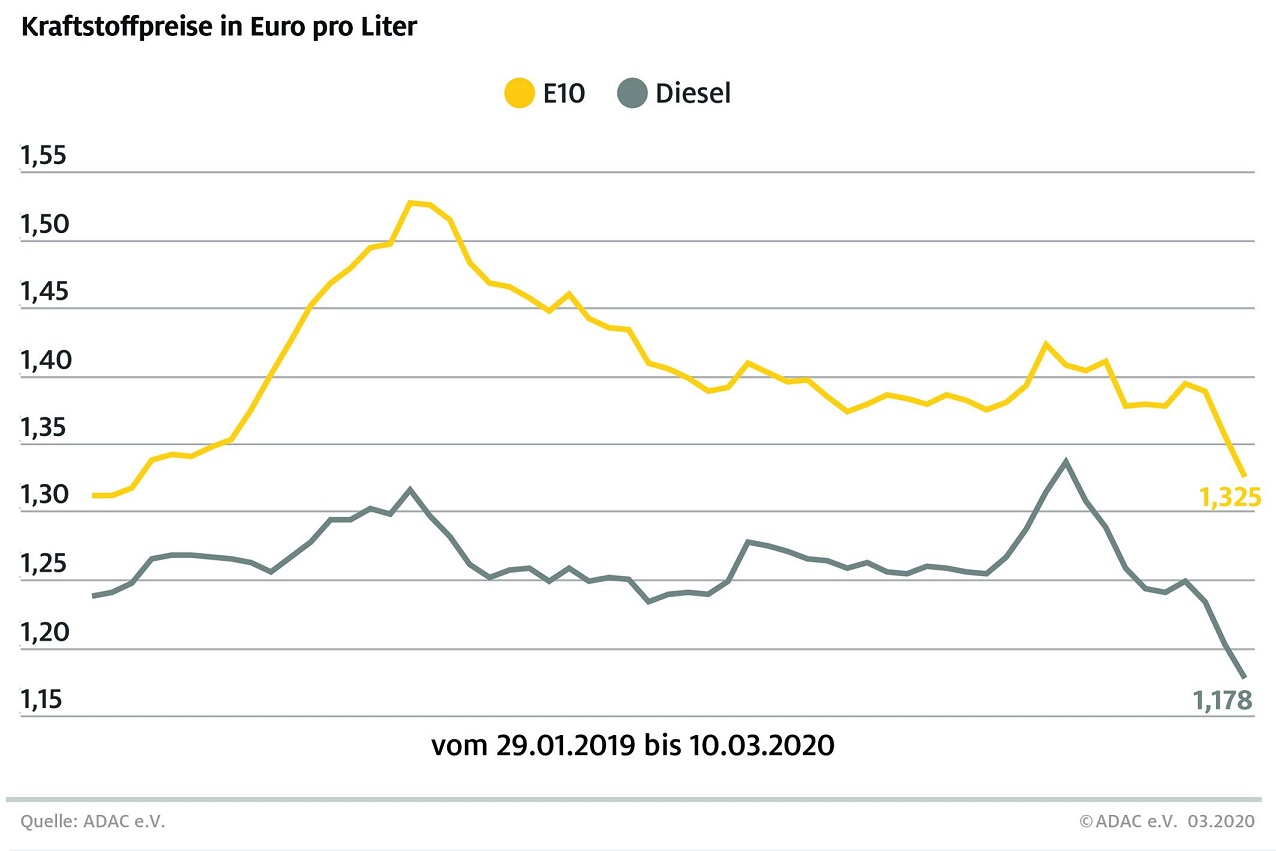 Der Kraftstoffmarkt steht weiter unter dem Eindruck der Coronavirus-Krise. Aus Angst vor einer weltweiten Rezession und angesichts des Konflikts über künftige Fördermengen zwischen den Ölproduzenten Saudi-Arabien und Russland stürzten die Rohölnotierungen regelrecht ab. Ein Barrel der Sorte Brent kostete zeitweise weniger als 35 Dollar. Aktuell haben sich die Preise zwar leicht auf knapp 38 Dollar erholt, das sind aber immer noch über 14 Dollar weniger als vor einer Woche. Der Euro zeigte sich relativ stabil. Er hat im Vergleich zur Vorwoche leicht zugelegt und liegt im Bereich von 1,13 Dollar.