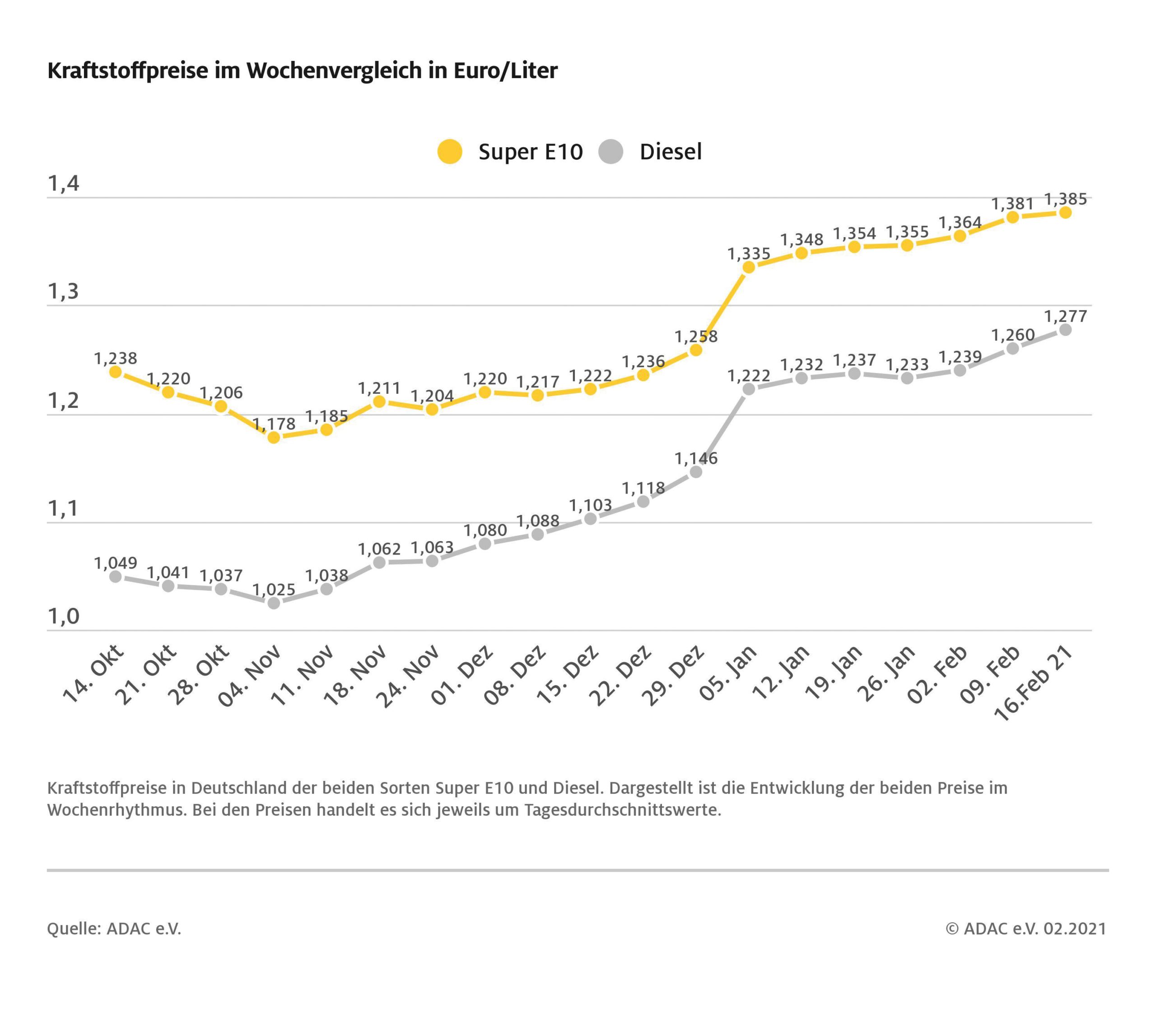 Der Preisanstieg bei Benzin und Diesel setzt sich fort – dies zeigt die wöchentliche ADAC Auswertung der Kraftstoffpreise. Für einen Liter Super E10 müssen die Autofahrer demnach 1,385 Euro bezahlen, das sind 0,4 Cent mehr als in der Vorwoche. Benzin hat sich damit zum zehnten Mal in Folge im Rahmen der wöchentlichen Preisanalyse verteuert. Deutlich teurer ist Diesel: Ein Liter kostet aktuell im bundesweiten Mittel 1,277 Euro und damit 1,7 Cent mehr als vor Wochenfrist. Die Preisdifferenz zwischen den beiden Sorten Benzin und Diesel hat sich damit abermals verringert und beträgt jetzt nurmehr 10,8 Cent.