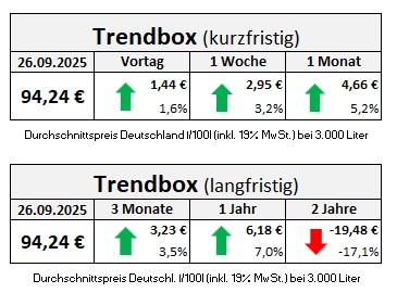 Die genannten Heizölpreise beziehen sich stets auf den deutschlandweiten Durchschnittspreis bei einer Bestellung von 3.000 Liter Heizöl Standard schwefelarm inklusive 19% MwSt. Außerdem fallen durch Transportkosten die Preise regional unterschiedlich aus. Stand der Preise 26.9.2025