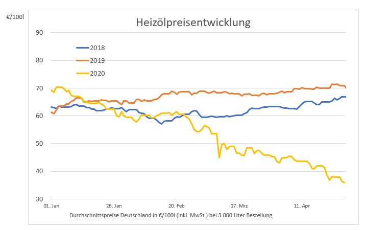 Ein weiterer, wenn auch etwas kleinerer Rutsch folgte am 21. April, als eine bestimmte Rohölsorte in den USA das erste Mal in der Geschichte ins Minus rutschte. Zeitweise gab es damit beim Kauf eines Barrels sogar noch Geld raus. Zwar beschränkte sich dieser Sachverhalt auf sehr spezifische Verkäufe und Sorten, doch der psychologische Effekt war enorm, so dass die Ölpreise insgesamt weiter nachgaben. Und mit ihnen auch die Heizölpreise, die damit inzwischen einen neuen Tiefststand erreicht haben.