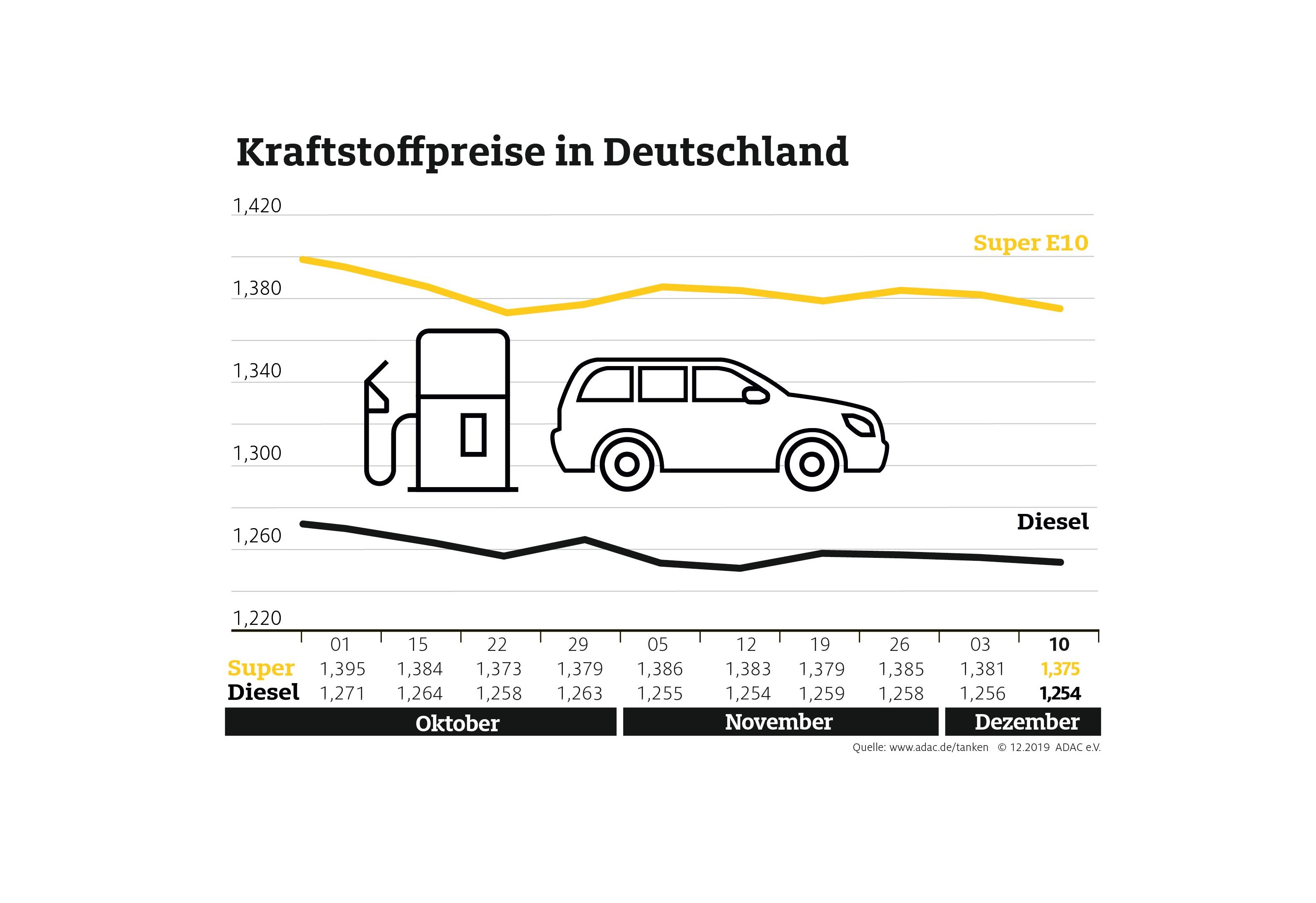 Autofahrer können im Bundesdurchschnitt erneut preiswerter als in der Vorwoche tanken. Laut aktueller Auswertung des ADAC verbilligte sich ein Liter Super E10 im Bundesmittel um 0,6 Cent auf 1,375 Euro. Diesel kostet je Liter durchschnittlich 1,254 Euro, das sind 0,2 Cent weniger als noch vor einer Woche. Gleichzeitig sinkt die Preisdifferenz zwischen beiden Sorten auf nur noch 12,1 Cent.